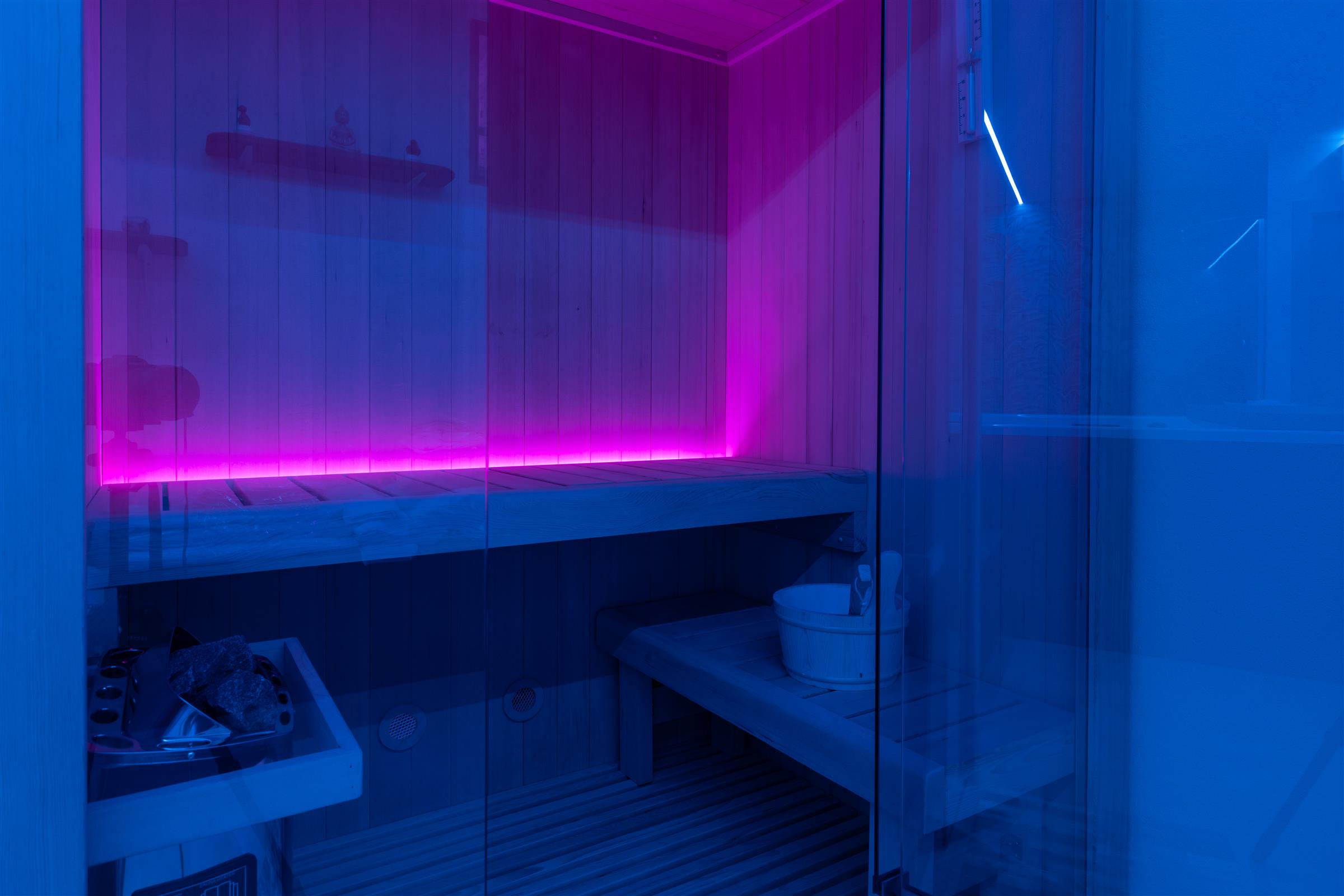 Accanto alla sauna, trovi una spaziosa vasca idromassaggio che può ospitare fino a sei persone. Immerso in un’atmosfera rilassante e illuminata da luci soffuse che cambiano colore, potrai distendere corpo e mente, lasciandoti avvolgere dai getti d’acqua che stimolano la circolazione e alleviano lo stress.